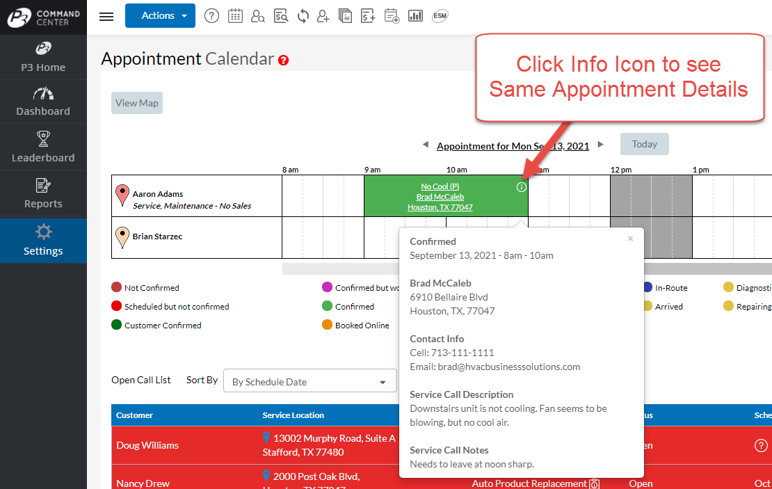 Now this option is great if you have a handful of technicians. However, beyond that, once the Dispatch Calendar is full, having to move the mouse across multiple appointments to get to the desired appointment can be cumbersome because each time the mouse moves into a time slot a new popup will appear.