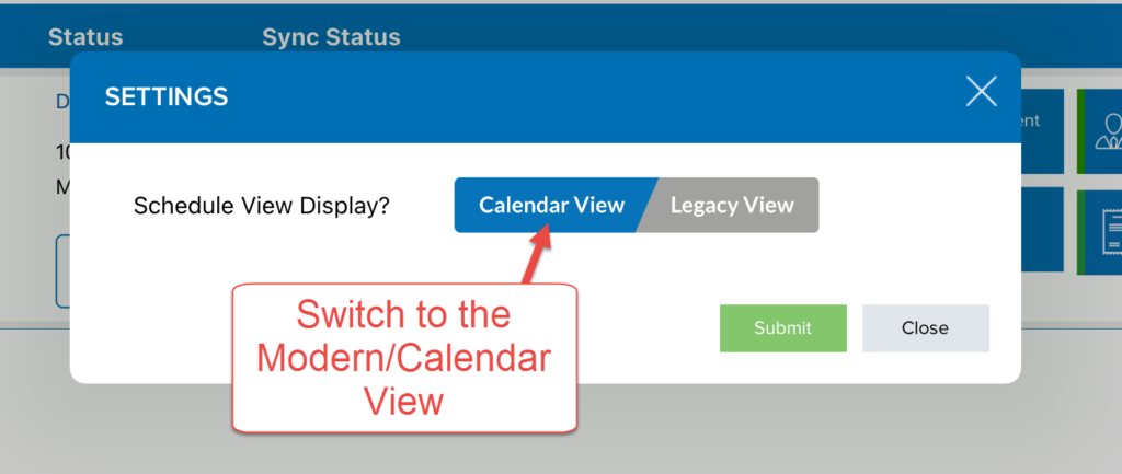 The “Legacy View” is the Current or Old View. Click “Calendar View”.
